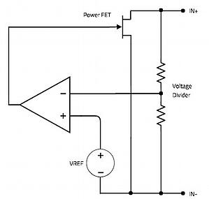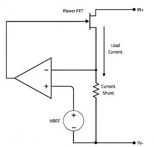 테스트중인 장치의 전류는 전력 FET와 전류 션트 저항을 통해 흐릅니다. 션트 저항기 양단의 전압은 기준 전압과 비교되며 두 전압의 차이는 전력 FET의 드레인-소스 저항 RDS를 제어하는 데 사용됩니다. 부하 전류가 원하는 정전류보다 높으면 회로는 FET의 게이트 전압을 조정하여 RDS를 증가시켜 부하 전류를 줄입니다. 부하 전류가 원하는 정전류보다 낮으면 회로가 게이트 전압을 조정하여 RDS를 줄이고 부하 전류가 증가합니다.